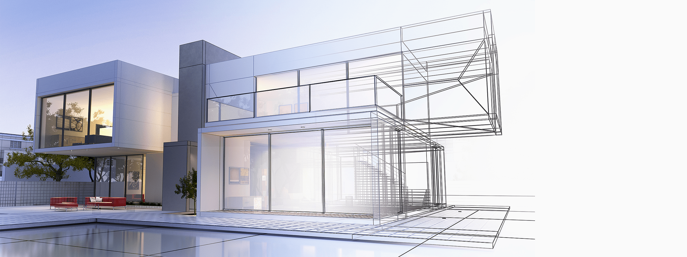 실내외 생활을 위한 거대한 데크를 통합하여 돌출된 지붕은 그늘을 제공합니다.